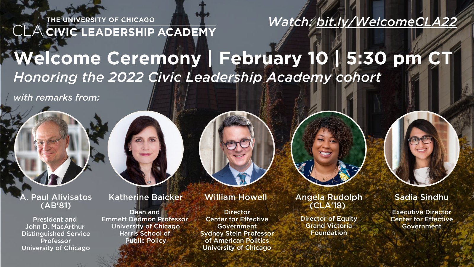 The Civic Leadership Academy is made possible through generous support from the Harris School of Public Policy Harris Family Foundation Searle Funds at the Chicago Community Trust Walder Foundation and Waraich Family Fund and has presented named fellowships to the following individuals. Every division and school across the University contribute to this impactful work. The Civic Leadership Academy CLA at the University of Chicago is an interdisciplinary certificate program for high-potential government and nonprofit.